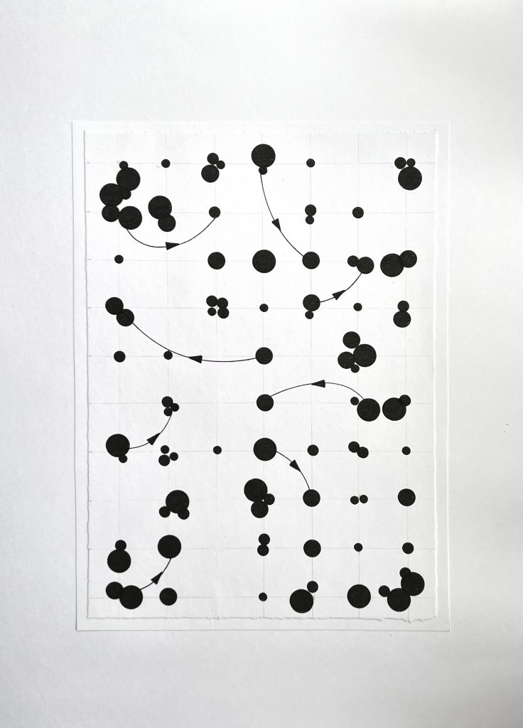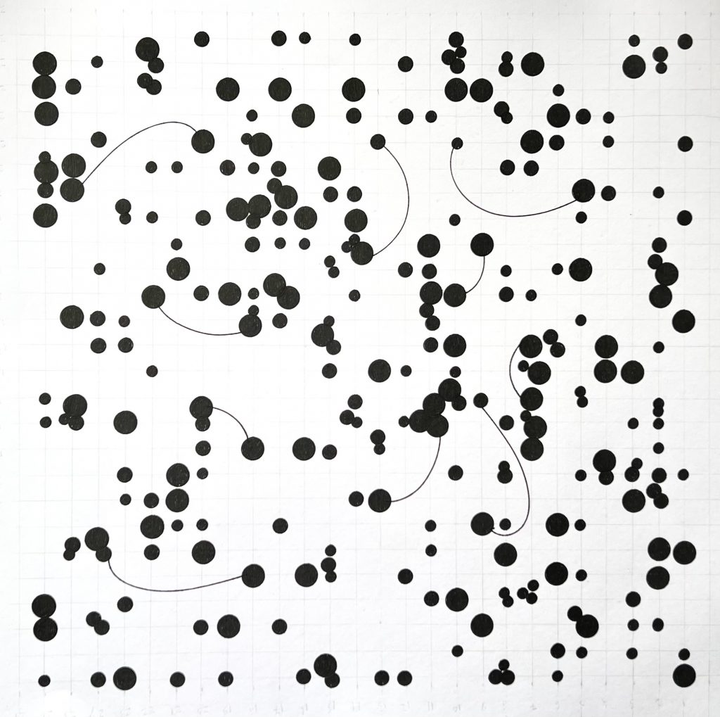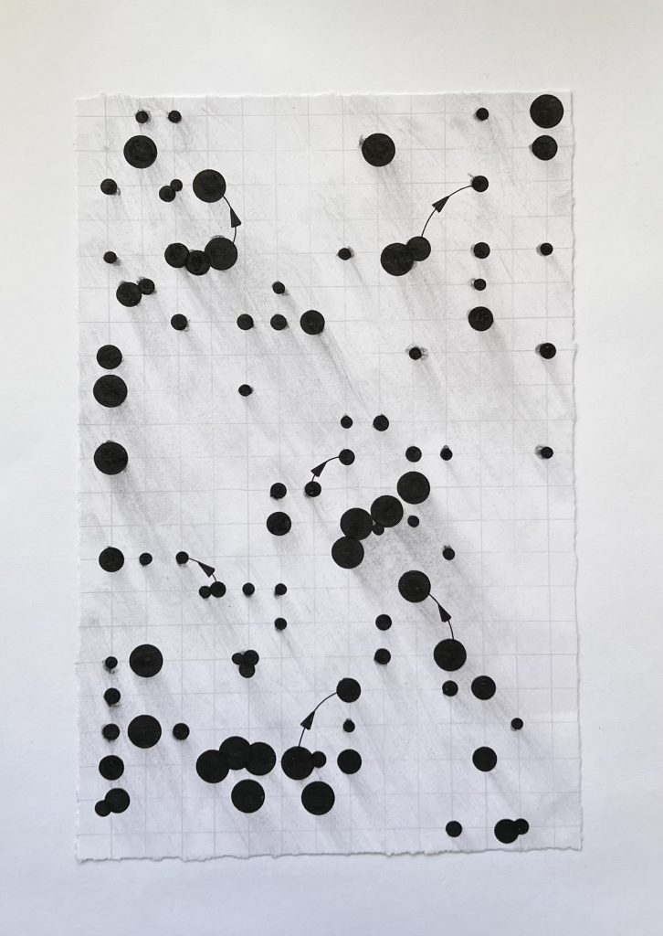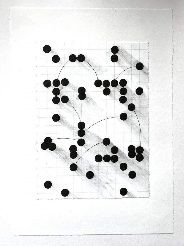 I wanted to create a series of pieces following the same methods that harness chance, initially as an experiment, but found the results to be fascinating. The strangeness of the arrangements…arrangements that would normally never occur to me, grew firstly from multiple dice throws and later by a random number generator app recorded onto a lightly pencilled grid. These are some results.