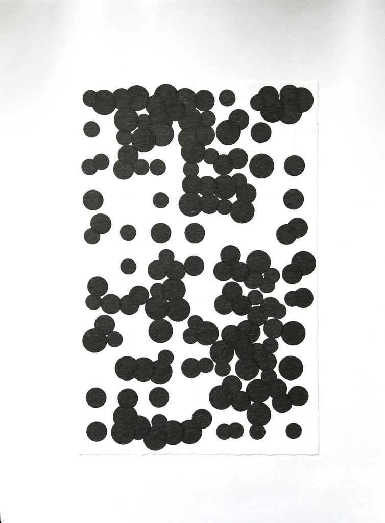I wanted to create a series of pieces following similar methods of my own that harness chance, initially as an experiment, but found the results to be fascinating. The strangeness of the arrangements…arrangements that would normally never occur to me, grew firstly from multiple dice throws and later by a random number generator app recorded onto a lightly pencilled grid. These are some results.