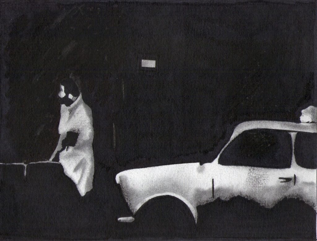 Man Leaving Car, East Germany. ( ink, charcoal drawing)